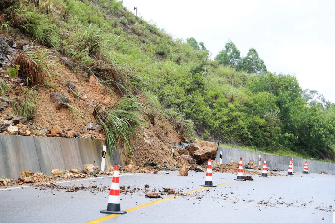 小编收到信息后立即赶往现场实地了解。在现场,小编看到长盛坳坡顶鹿寨往中渡方向左边山体已出现大块落石和泥土掉落,情况十分危险。
