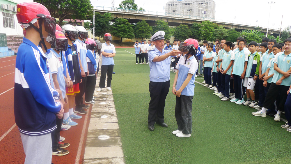 6月16日,鹿寨县交警部门在该县第一初级中学开展交通安全主题教育活动,引导同学们自觉摒弃交通陋习,遵守和维护交通秩序,养成文明出行的良好习惯。图为同学们正在学习正确佩戴安全头盔。 (杨继强)