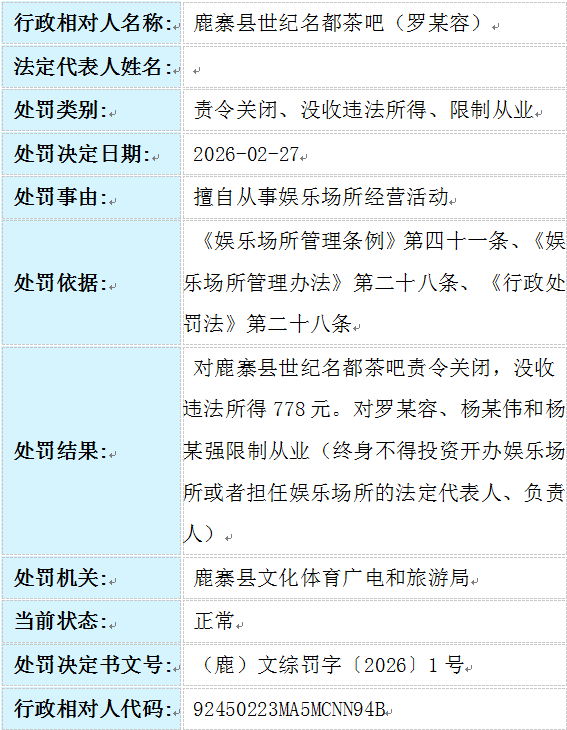 行政处罚决定书(鹿)文综罚字〔2026〕1号