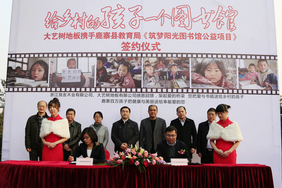 本网鹿寨讯(记者陈志良)上善若水,厚德载物。2月25日,浙江木业有限公司大艺树地板联合“中国下一代教育基金会”与鹿寨县合作“筑梦阳光图书馆公益项目”签字仪式在浙江良友木业有限集团总部举行,在江苏浙江招商考察的县四家班子领导刘胜友、韦宁、袁子强、马耀洲、张建华,良友木业有限公司董事长兼总经理沈小红等见证了签字仪式。