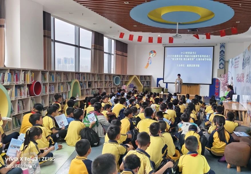 4 月 23 日上午,鹿寨县图书馆内书香四溢、朝气蓬勃,来自寨沙镇中心校的两百多名学生开启了一场以“探宝图书馆 智启新世界”为主题的红领巾研学活动。此次活动旨在引导学生亲近书籍,感受阅读魅力,在知识的海洋中汲取成长养分。