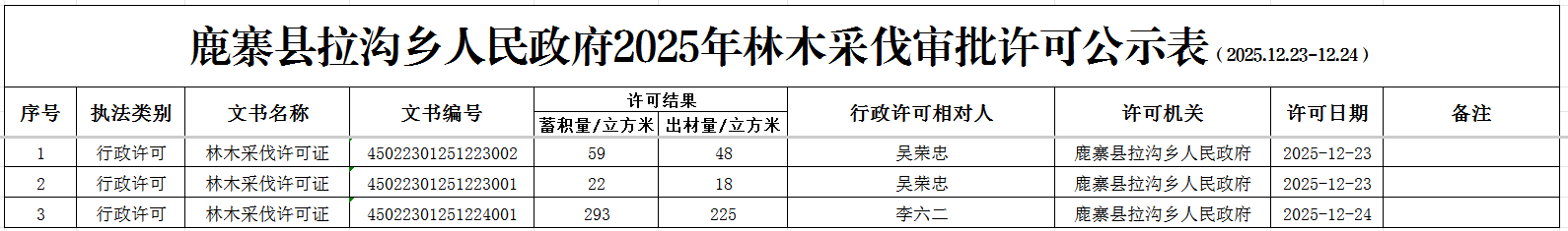 鹿寨县拉沟乡人民政府2025年林木采伐审批许可公示表(2025.12.23-12.24)