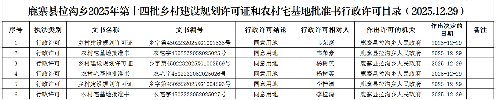 鹿寨县拉沟乡2025年第十四批乡村建设规划许可证和农村宅基地批准书行政许可目录(2025.12.29)