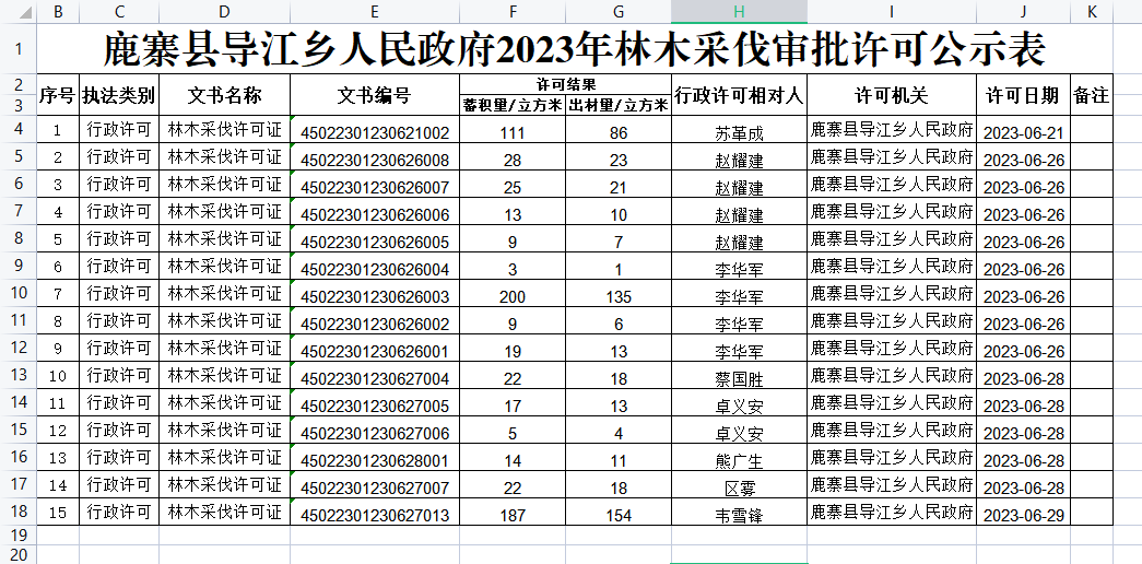 鹿寨县导江乡人民政府2023年林木采伐审批许可公示表(2023.6.29)