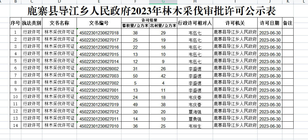 鹿寨县导江乡人民政府2023年林木采伐审批许可公示表(2023.6.30)