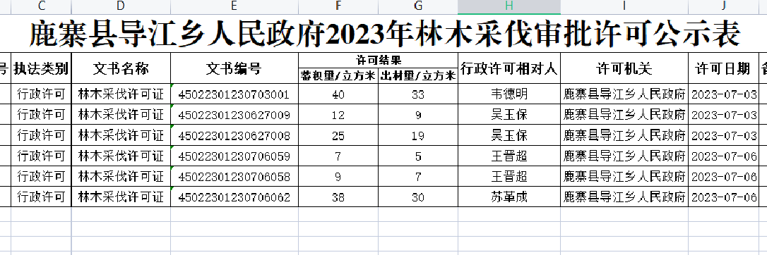 鹿寨县导江乡人民政府2023年林木采伐审批许可公示表(2023.7.06)