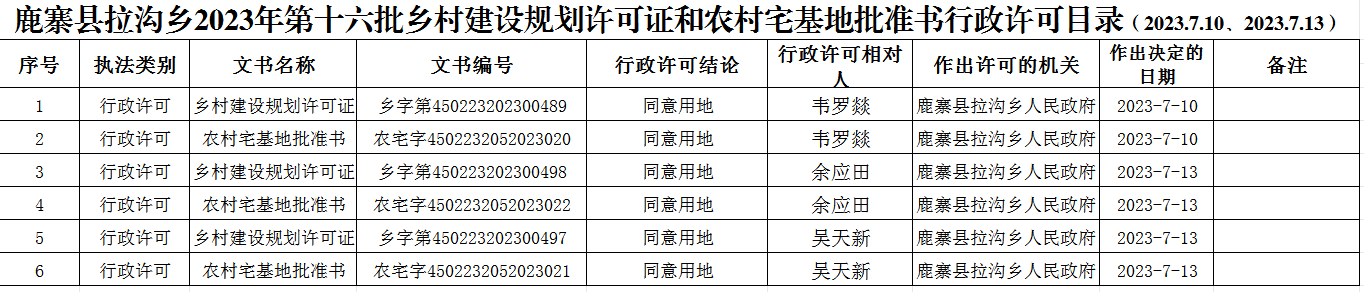 鹿寨县拉沟乡2023年第十六批乡村建设规划许可证和农村宅基地批准书行政许可目录(2023.7.10、2023.7.13)
